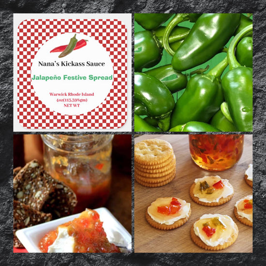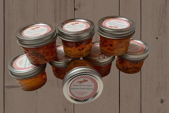 Jalapeño Festive Spread 8oz Jar 6.99Jalapeño Spread is a delicious sweet and spicy spread for toast or crackers,and can be used as a glaze or sauce on any kind of meat. This sweet and spicy spread is great is great for many use. Delicious with cream cheese and crackers. 100% all natural with no preservatives