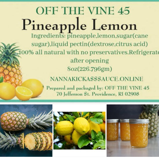 Pineapple Lemon 🍍🍋Jam 8oz Jar $7.99This sunny tropical spread is perfect sandwiches, pancakes, waffles and toast, and unbelievable as an ice cream topping. Made with fresh pineapple and tangy lemons. Just the right amount of sugar to add just the right amount to complement the tangy sweetness. 100% all natural with no preservatives