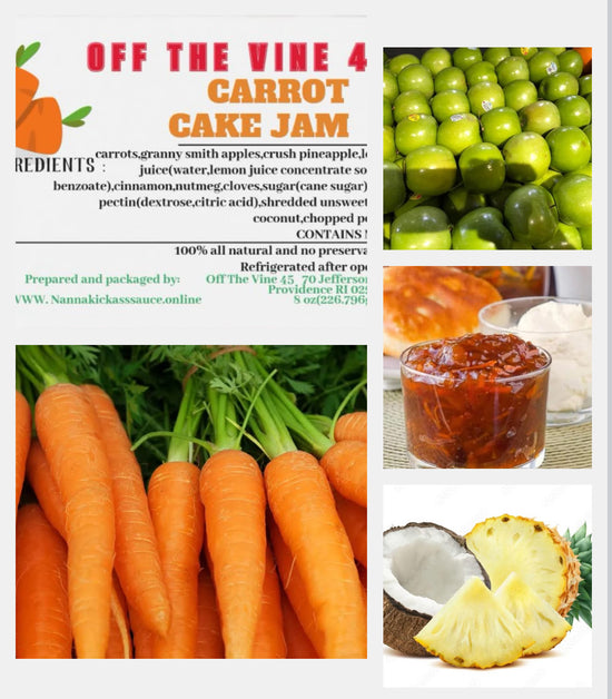 Carrot Cake Jam 🥕🥥8oz Jars $7.99Calling carrot cake lovers !!!! Rich flavors of this delicious cake in a jar. Freshly shredded orange carrots, chopped apples, juicy pineapples, coconut, and nuts suspended in a lovely spiced jam. Serve on English muffins, with yogurt, pancakes, waffles, along side cheese and crackers, or with vanilla ice cream.